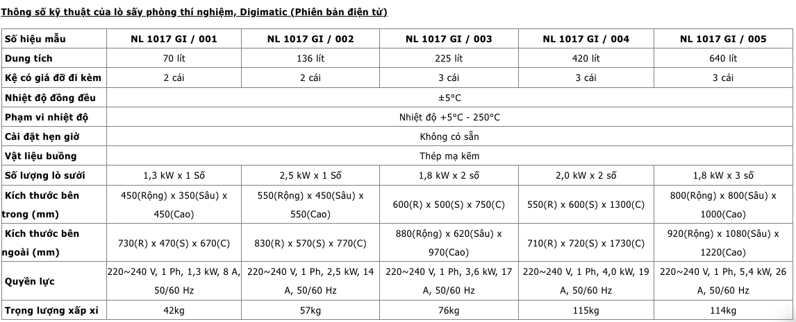 Tủ sấy NL Scientific Digimatic được thiết kế để sấy mẫu. Có nhiều kích cỡ khác nhau (70 lít, 136 lít, 225 lít, 420 lít, 640 lít), loạt lò này được trang bị các kệ có thể điều chỉnh. Vỏ thép cán nguội chất lượng cao, lớp phủ men nung bên ngoài và lớp bên trong chống ăn mòn làm cho đây trở thành lò sấy phòng thí nghiệm đa năng chắc chắn.